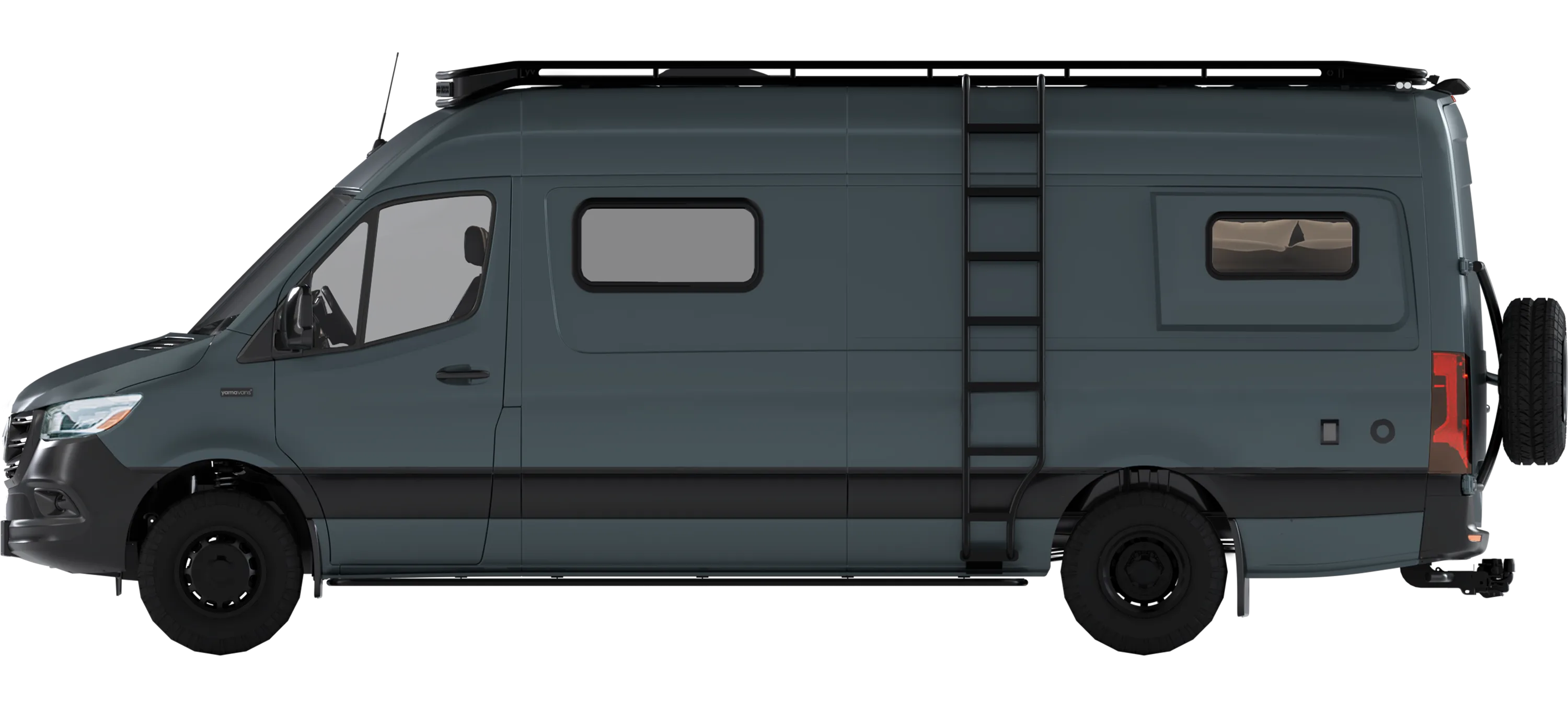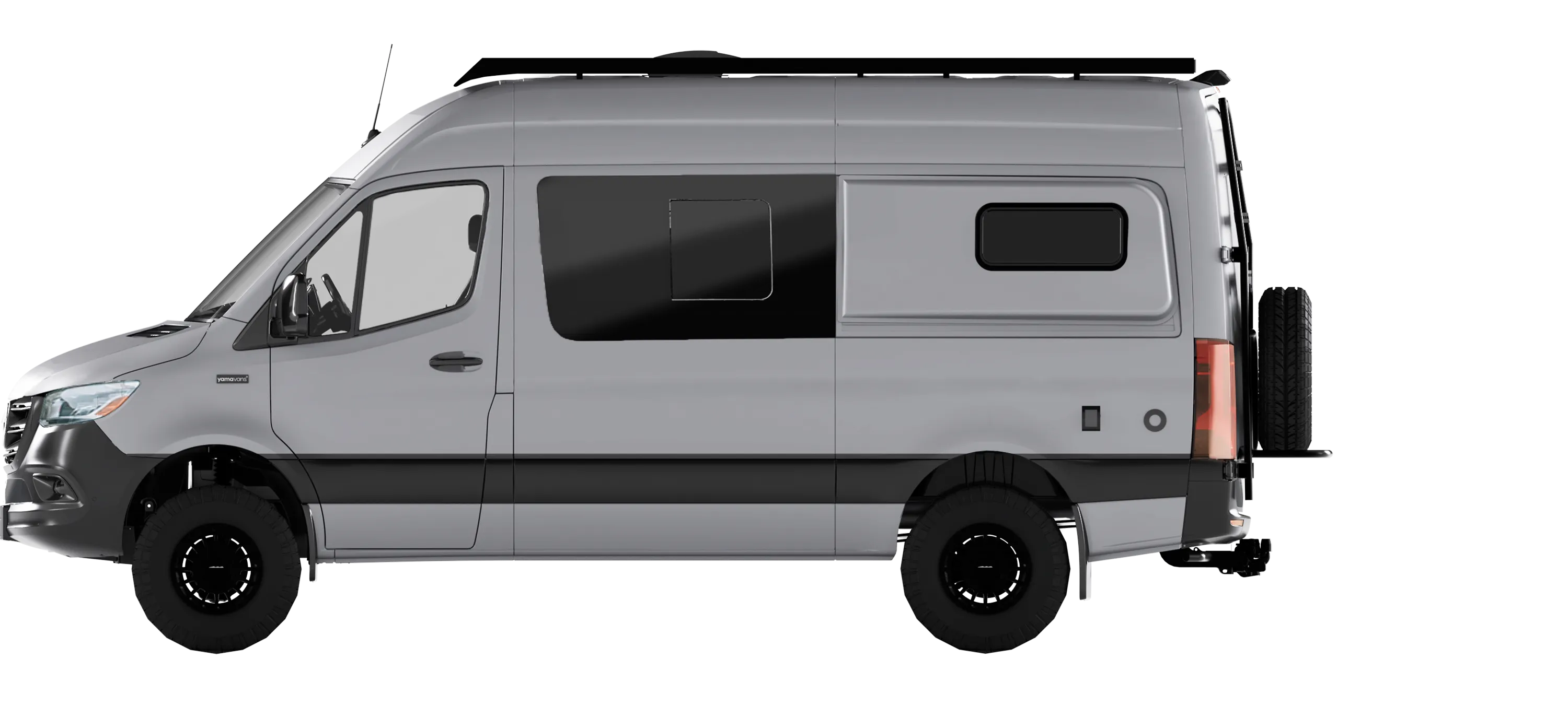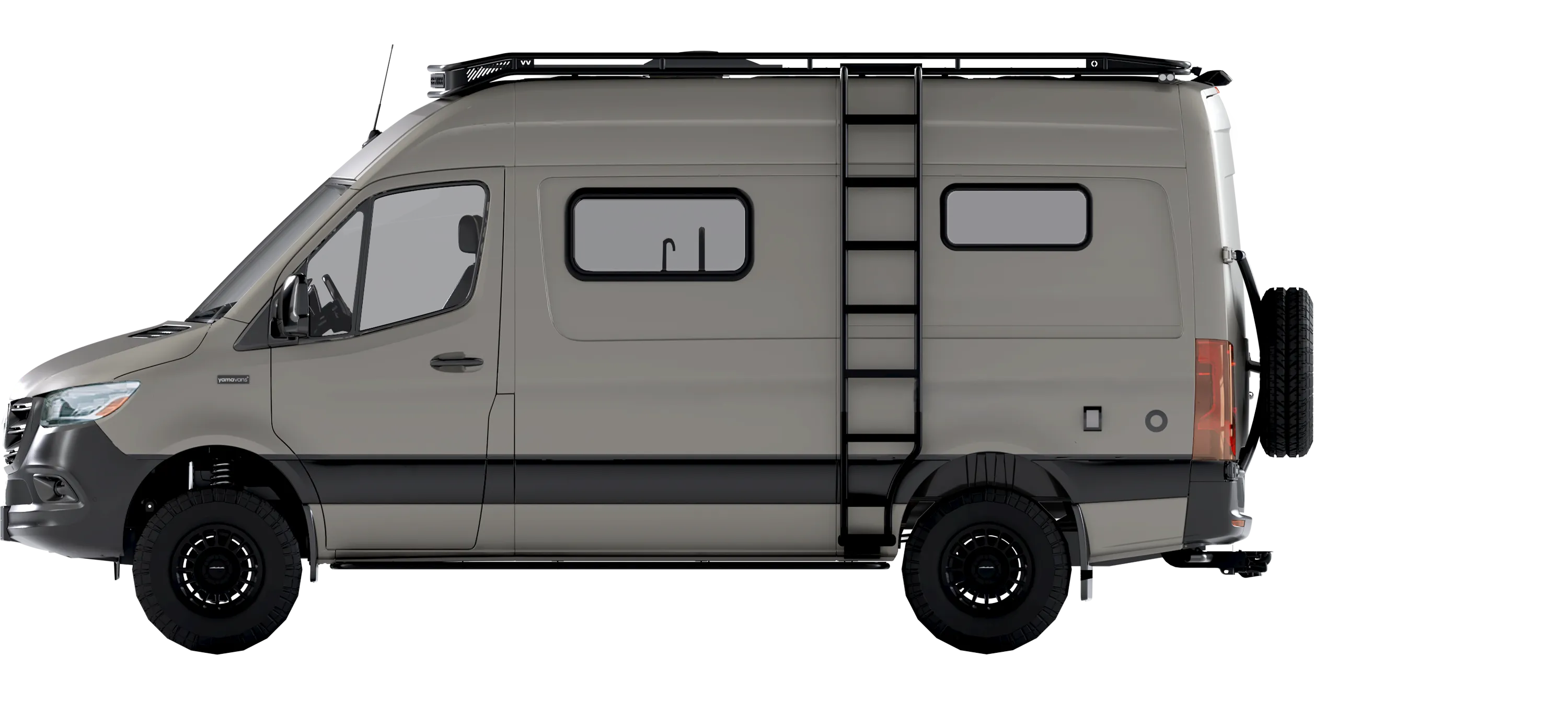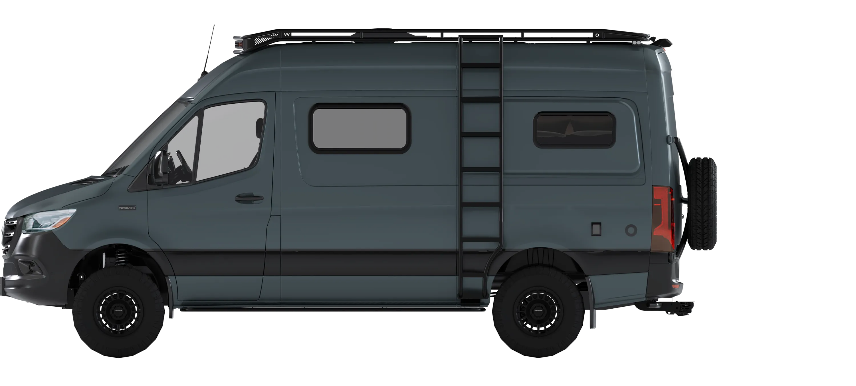 95 ft³ gear garage with extended length for even the tallest travelers' skis and bikes. Wall and floor T-track, 12V and 120V power, and an outdoor wash station let you secure your gear and keep the van’s interior clean.