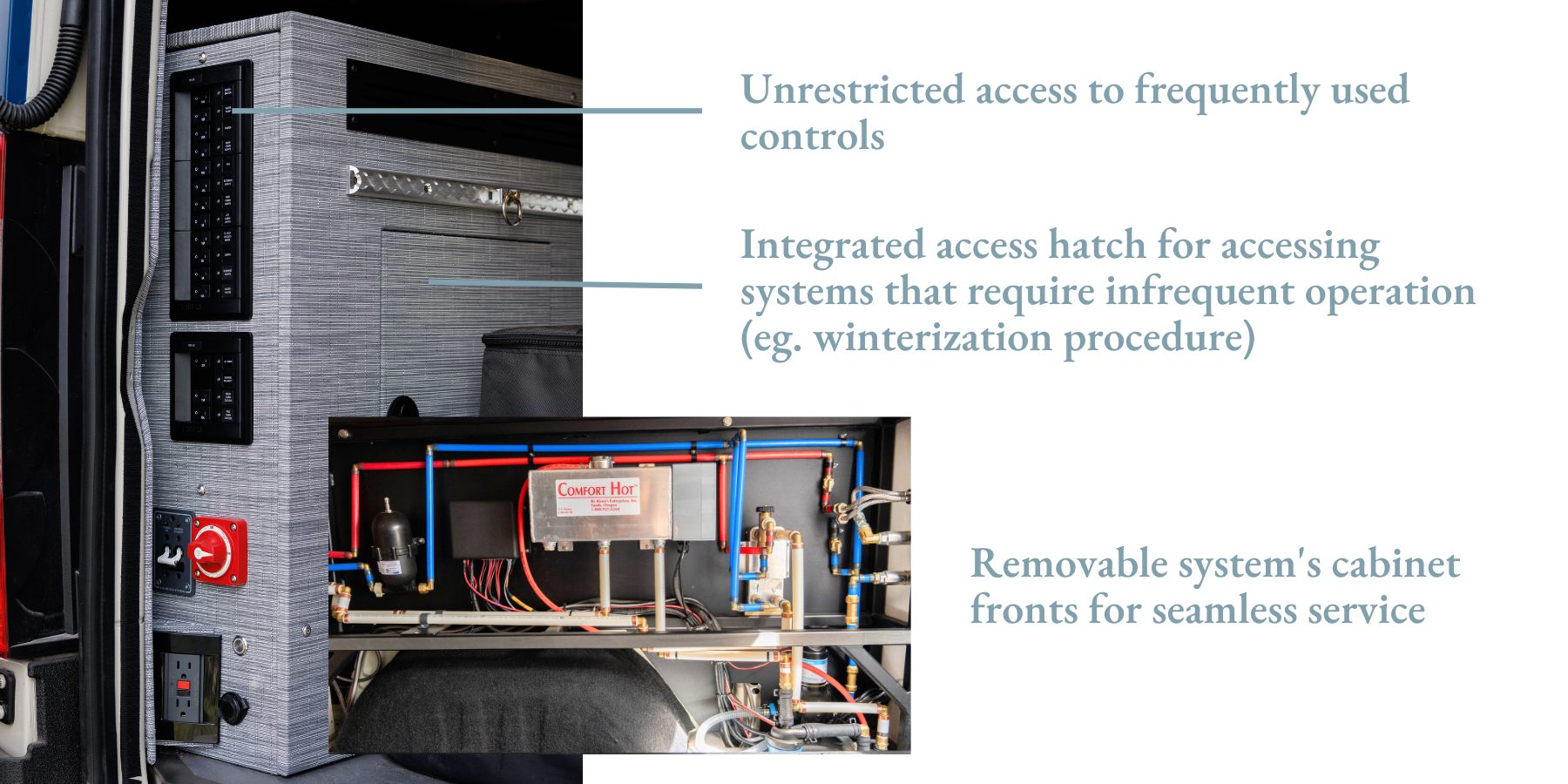 Serviceability is top of mind for our Design Team. With every new design we create, we ensure that all the mechanical systems can be accessed with ease, streamlining any maintenance or checks that might be needed along your journey. Whether you’re getting your hands dirty, dropping the van off at Yama HQ, or working with one of our remote service partners, we ensure that your systems are quick and simple to access.